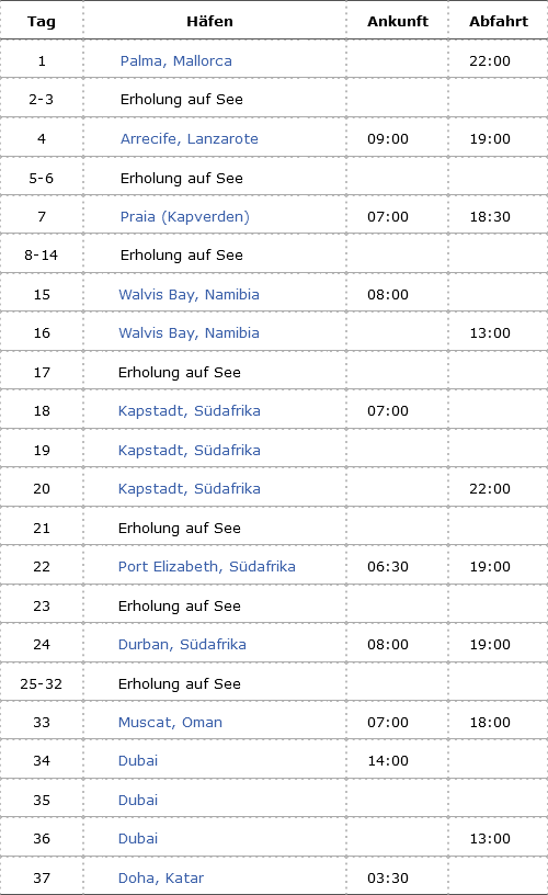 Kreuzfahrt Weltentdecker-Route ab Palma bis Doha: Palma de Mallorca, Lanzarote, Praia (Kapverden), Walvis Bay (Namibia), Kapstadt (Südafrika), Port Elizabeth (Südafrika), Durban (Südafrika), Muscat (Oman), Dubai, Doha (Katar)
