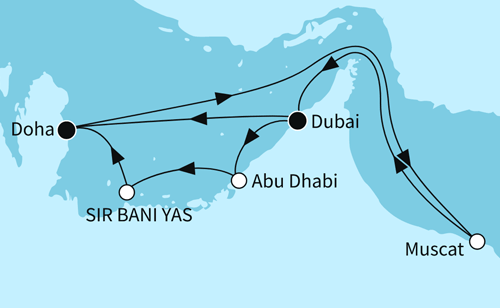 Kreuzfahrt Zauber des Orients ab Dubai bis Doha: Dubai, Abu Dhabi, Sir Bani Yas, Doha (Katar), Muscat (Oman), Dubai, Doha (Katar)