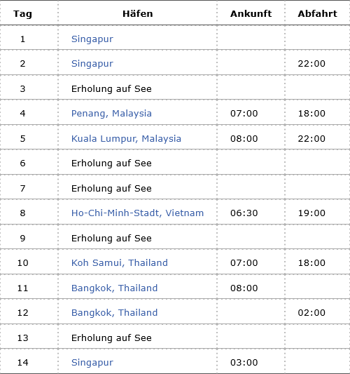 Kreuzfahrt Faszination Südostasien ab Singapur: Singapur, Penang (Malaysia), Kuala Lumpur (Malaysia), Ho-Chi-Minh-Stadt (Vietnam), Insel Koh Samui (Thailand), Bangkok (Thailand), Singapur