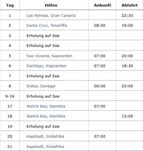 Kreuzfahrt Höhepunkte entlang Westafrikas Küste: Las Palmas (Gran Canaria), Teneriffa, Sao Vicente (Kapverden), Santiago (Kapverden), Dakar (Senegal), Walvis Bay (Namibia), Kapstadt (Südafrika)