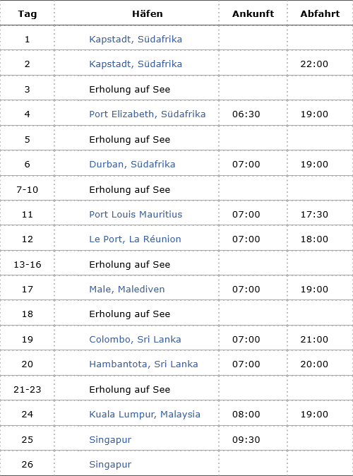 Kreuzfahrt Indischer Ozean mit Mauritius: Kapstadt (Südafrika), Port Elizabeth (Südafrika), Durban (Südafrika), Port Louis (Mauritius), Reunion, Male (Malediven), Colombo (Sri Lanka), Hambantota (Sri Lanka), Kuala Lumpur (Malaysia), Singapur