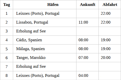 Kreuzfahrt Sommerzeit an der Westküste mit Marokko: Leixoes-Porto (Portugal), Lissabon (Portugal), Cadiz (Spanien), Malaga (Spanien), Tanger (Marokko), Leixoes-Porto (Portugal)