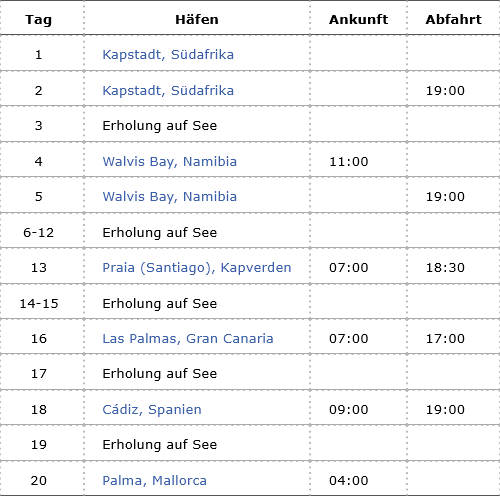 Kreuzfahrt Transozean: Kapstadt (Südafrika), Walvis Bay (Namibia), Praia (Kapverden), Las Palmas (Gran Canaria), Cadiz (Spanien), Palma de Mallorca
