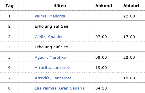 Kreuzfahrt Die Südspitze Europas: Palma de Mallorca, Cadiz (Spanien), Agadir (Marokko), Arrecife (Lanzarote), Las Palmas (Gran Canaria)