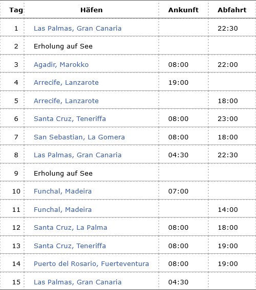 Kreuzfahrt Kanaren, Madeira und marokkanisches Flair: Las Palmas (Gran Canaria), Agadir (Marokko), Lanzarote, Teneriffa, La Gomera, Las Palmas (Gran Canaria), Funchal (Madeira), La Palma, Teneriffa, Fuerteventura, Las Palmas (Gran Canaria)