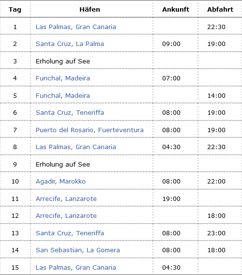 Kreuzfahrt Kanaren, Madeira und marokkanisches Flair: Las Palmas (Gran Canaria), Santa Cruz (La Palma), Funchal (Madeira), Santa Cruz (Teneriffa), Puerto del Rosario (Fuerteventura), Las Palmas (Gran Canaria), Agadir (Marokko), Arrecife (Lanzarote), Santa Cruz (Teneriffa), La Gomera, Las Palmas (Gran Canaria)