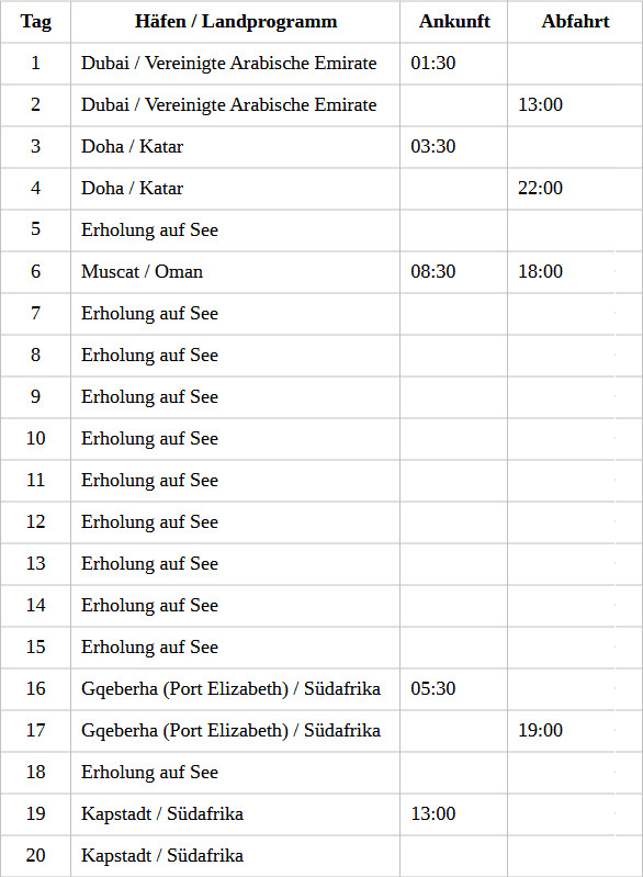 Kreuzfahrt Auszeit zwischen den Kontinenten: Dubai, Doha (Katar), Muscat (Oman), Port Elizabeth (Südafrika), Kapstadt (Südafrika)