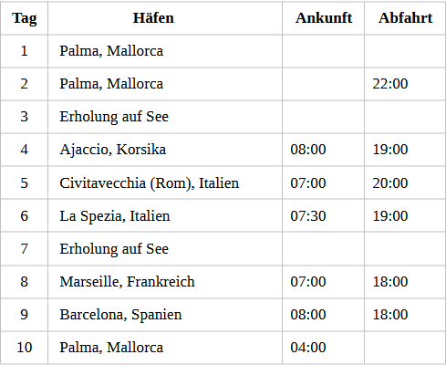 Kreuzfahrt Höhepunkte des westlichen Mittelmeers: Palma de Mallorca, Ajaccio (Korsika), Civitavecchia (Rom), La Spezia (Italien), Marseille (Frankreich), Barcelona (Spanien), Palma de Mallorca