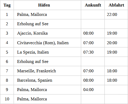 Kreuzfahrt Höhepunkte des westlichen Mittelmeers: Palma de Mallorca, Ajaccio (Korsika), Civitavecchia (Rom), La Spezia (Italien), Marseille (Frankreich), Barcelona (Spanien), Palma de Mallorca