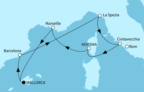 Kreuzfahrt Höhepunkte des westlichen Mittelmeers: Palma de Mallorca, Barcelona (Spanien), La Spezia (Italien), Civitavecchia-Rom (Italien), Ajaccio (Korsika), Marseille (Frankreich), Palma de Mallorca