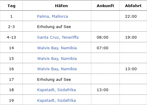 Kreuzfahrt Namibia und Südafrika intensiv: Palma de Mallorca, Santa Cruz (Teneriffa), Walvis Bay (Namibia), Kapstadt (Südafrika)