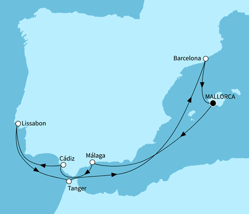 Kreuzfahrt Sonniges Iberien und Marokko: Palma de Mallorca, Malaga (Spanien), Cadiz (Spanien), Lissabon (Portugal), Tanger (Marokko), Barcelona (Spanien), Mallorca