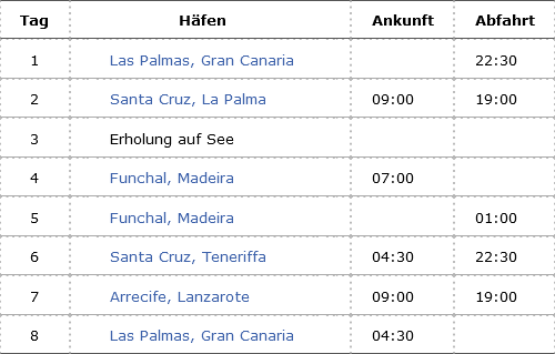 Kreuzfahrt Kanaren mit Madeira - ab/bis Las Palmas: Las Palmas (Gran Canaria), Santa Cruz (La Palma), Funchal (Madeira), Santa Cruz (Teneriffa), Arrecife (Lanzarote), Las Palmas (Gran Canaria)