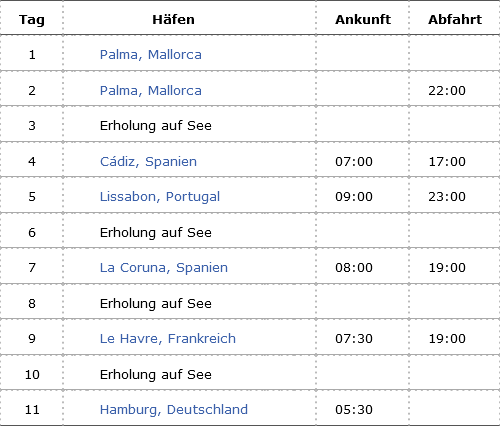 Kreuzfahrt Westeuropa: Palma de Mallorca, Cadiz (Spanien), Lissabon (Portugal), La Coruna (Spanien), Le Havre (Frankreich), Hamburg