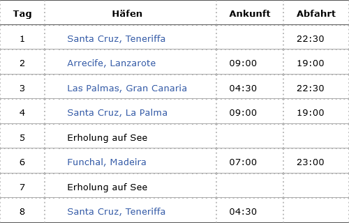 Kreuzfahrt Kanaren mit Madeira und La Palma ab Santa Cruz: Santa Cruz (Teneriffa), Lanzarote, Las Palmas (Gran Canaria), La Palma, Funchal (Madeira), Santa Cruz (Teneriffa)