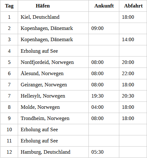 Kreuzfahrt Schönheiten des Nordens: Kiel, Kopenhagen (Dänemark), Nordfjordeid (Norwegen), Alesund (Norwegen), Geiranger (Norwegen), Hellesylt (Norwegen), Molde (Norwegen), Trondheim (Norwegen), Hamburg
