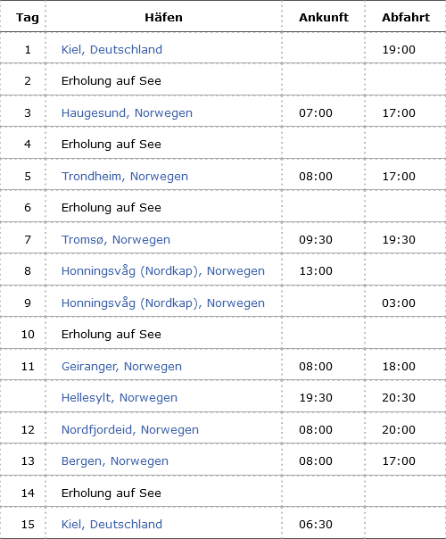 Kreuzfahrt Norwegen mit Nordkap: Kiel, Haugesund (Norwegen), Trondheim (Norwegen), Tromsö (Norwegen), Honningsvag (Nordkap), Geiranger (Norwegen), Hellesylt (Norwegen), Nordfjordeid (Norwegen), Bergen (Norwegen), Kiel
